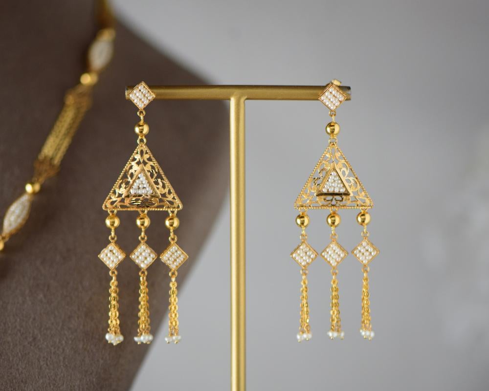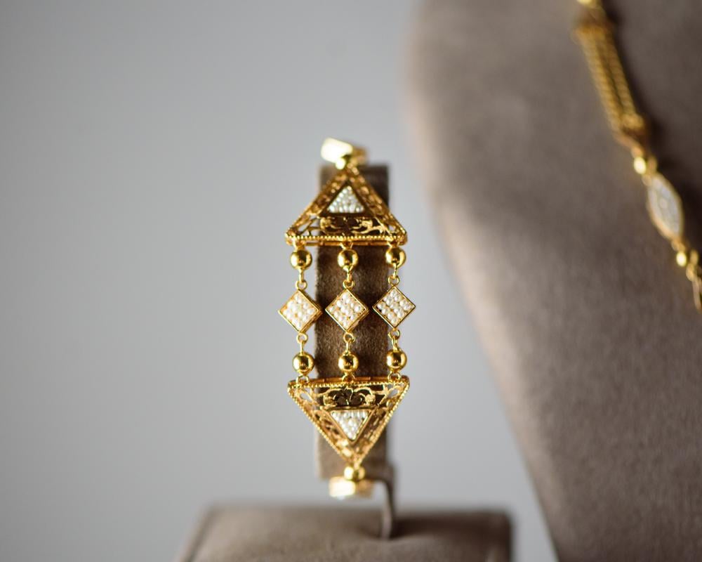 سبحة فاخرة مع حلق وخاتم وسوارة من الذهب البحريني عيار 21 محلاة باللؤلؤ الطبيعي الناشئ في المياه العذبة