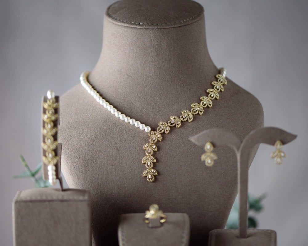 • يتكوَّن الطقم من سلسلة مُرصَّعة باللؤلؤ من ناحية والذهب عيار 18 من ناحية أخرى، مع خاتم بتصميم بسيط أنيق وحلق ملكي مميز وأنسيال مرصَّع باللؤلؤ أيضًا.