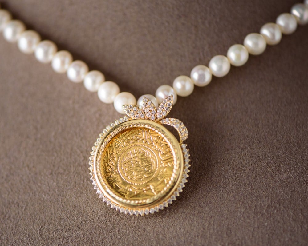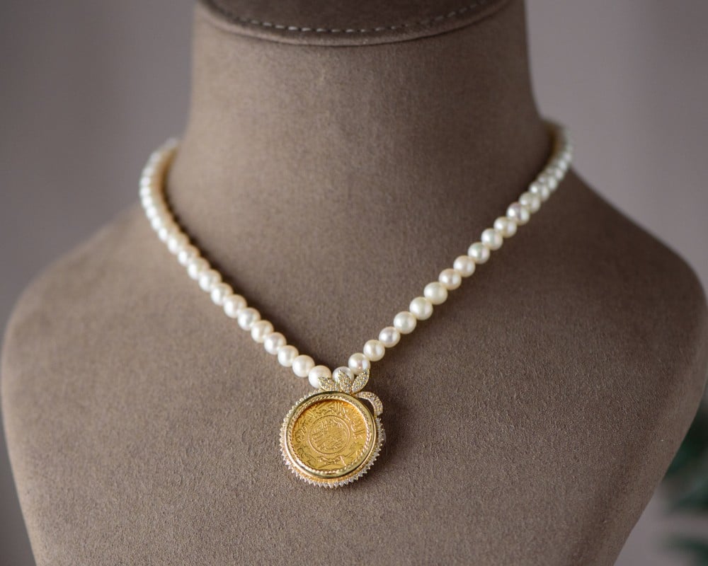 عقد لؤلؤ ملكي مع تعليقة ذهب عيار 18 وجنيه ذهب عيار 21
