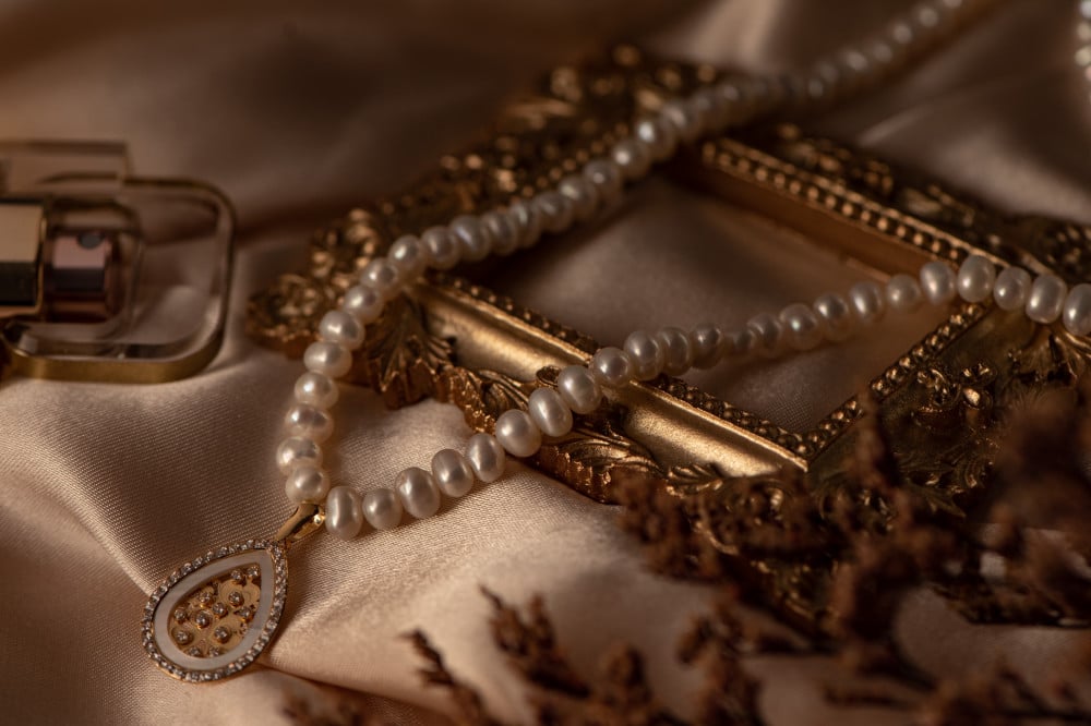 تعليقة ذهب عيار 18 مع صدف صناعي، تتوسط عقد لولو زراعي عالي الجودة.