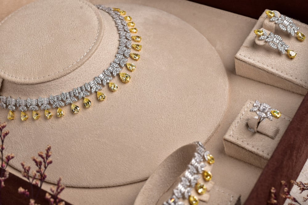 التألُّق في المناسبات والسهرات يصبح ممكنًا وفي متناول يدك عند اقتناء هذا الطقم من الذهب المحلى بالفانسي المعالج الفاخر، إنه خلَّابٌ يجذب إليك الأنظار بتصميمه الفريد الذي يجمع بين اللونين الذهبي والفضي بلمعان لا يمكن مقاومته، يتألَّف من القطع التي تحتاجين إليها في كل الأوقات، أما عن تصنيعه فهو مُتقَن بجودة عالية وهو بمستوى الألماس حديث يمنحك إطلالة براقة إذ أبدعه خبراء مجوهرات اليافعي "جمان" بصياغة احترافية.