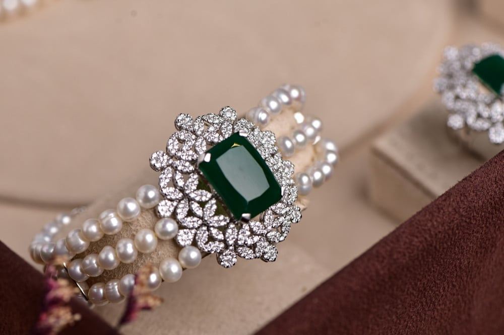 مجوهرات اليافعي "جمان"، إنه متخصص في التصميمات الراقية دون منازع؛ لأن لديه خبراء يهتمون بالتفاصيل الدقيقة، الطقم كامل مُكوَّن من خمس قطع تُلبِّي كل احتياجاتك، تصميمه مزيج من بريق اللولو ولمعان الأحجار
